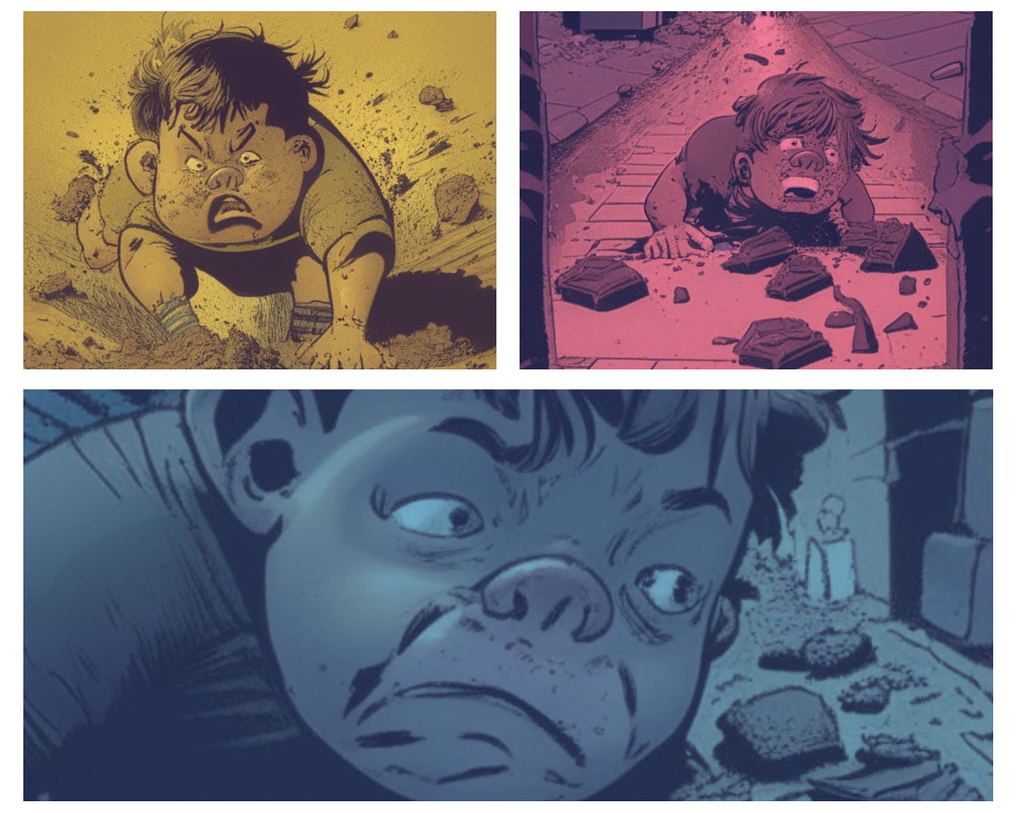 He ran all the way home, sweating and snorting and covered head to toe in sticky chocolate smudge. When he got home, his mother saw the way he looked and screamed:
